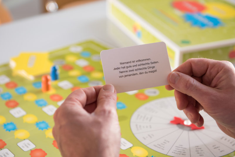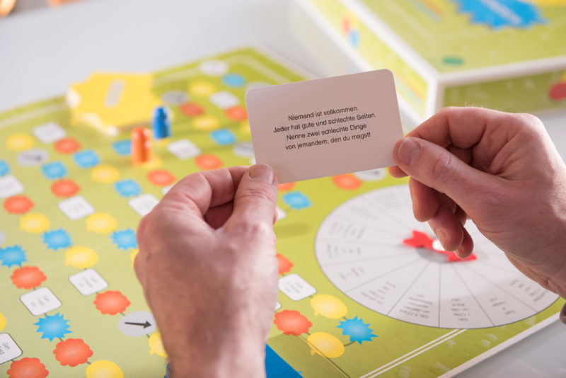 In dem vielfach bewährten Brettspiel werden Fragen beantwortet oder Handlungsaufforderungen ausgeführt, um Chips zu gewinnen. Durch eine Drehscheibe können zusätzliche Chips gewonnen oder verloren werden. Zu den drei Themen Reden, Fühlen und Handeln liegen jeweils 104 Spielkarten vor. Altersspezifisch kann daraus für jede Spielsituation ein individuelles Kartenset ausgewählt werden.
