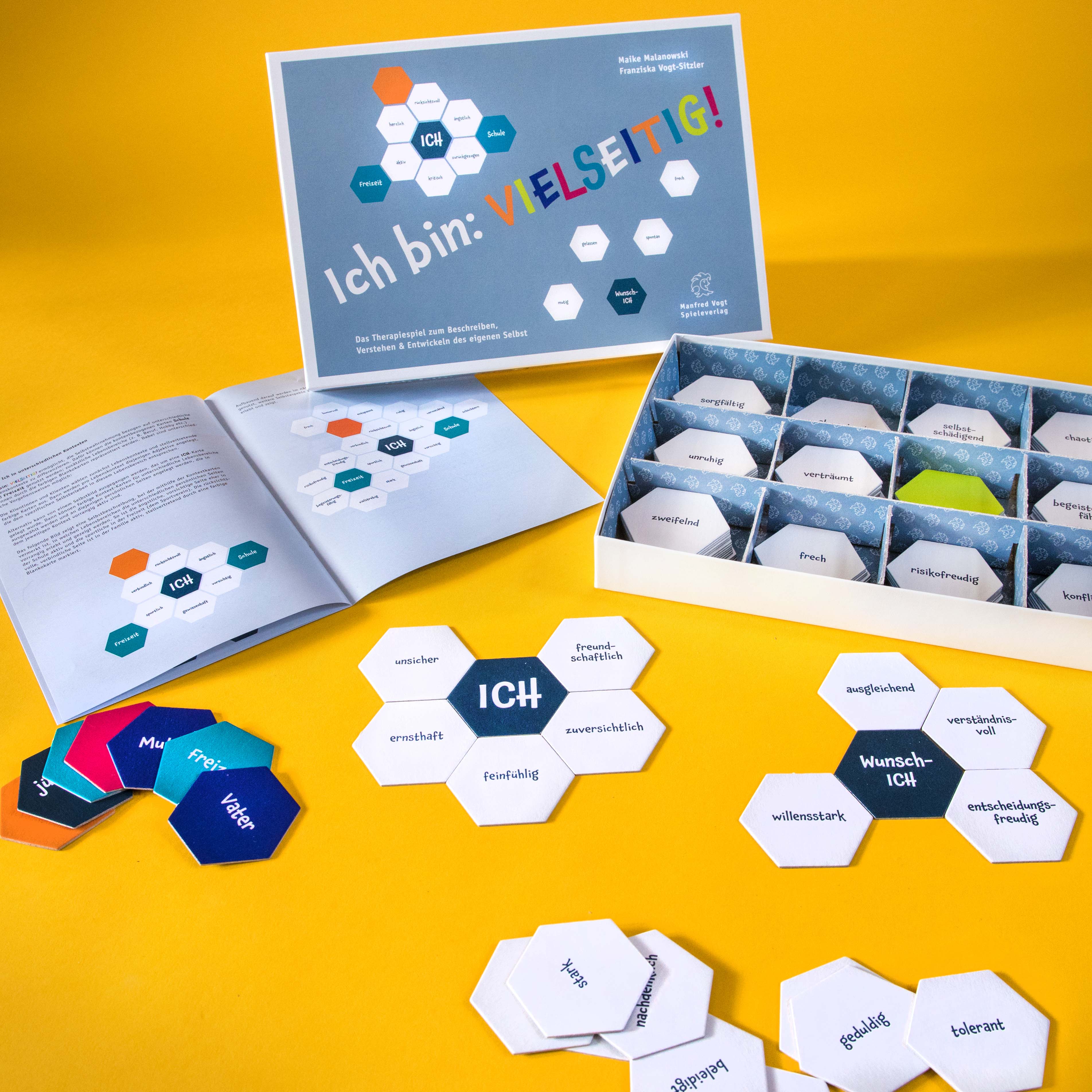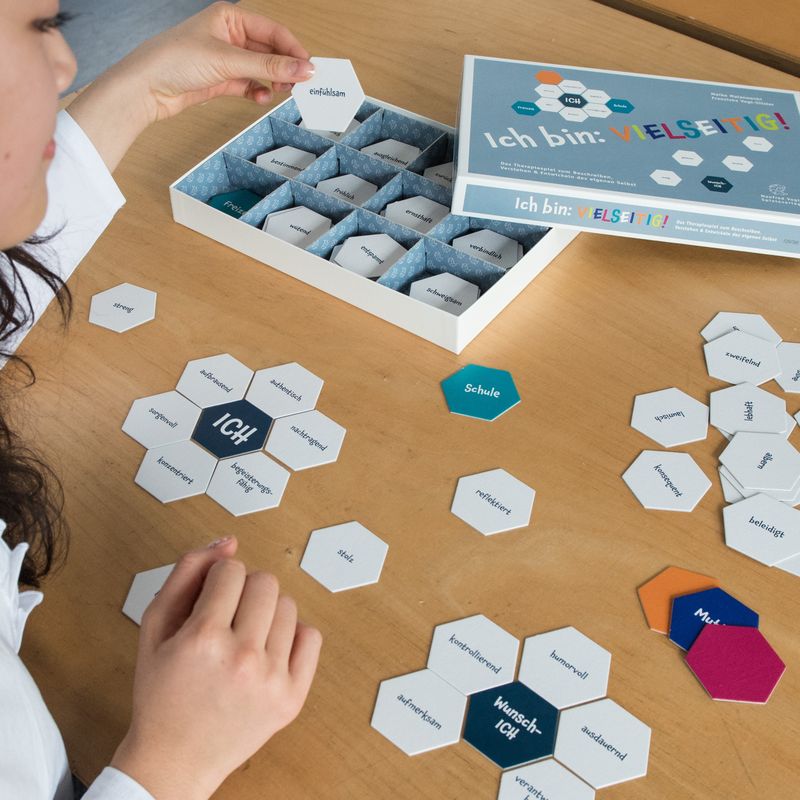 Sich mit seinen verschiedenen Seiten zeigen: den Schokoladenseiten, den starken und schwachen Seiten und den Sonnen- und Schattenseiten. Konzepte wie die Teilearbeit, die Arbeit mit dem inneren Team oder die Arbeit mit Ego-States unterstützen Klientinnen und Klienten dabei, ihre inneren Anteile und Seiten zu erkennen, zu akzeptieren, zu nutzen und zu erweitern. Ich bin: VIELSEITIG! bietet eine Sammlung von insgesamt 150 unterschiedlichen Adjektiven, die der Selbstbeschreibung, dem Selbstverständnis und der Selbstentwicklung dienen. Im Zentrum des Spiels steht die ICH-Karte, an deren Seiten Adjektive angelegt werden können, die als Ich-zugehörig empfunden werden. So kann ein aktuelles Selbstbild gelegt werden, das als Ausgangspunkt für weiterführende therapeutische Gespräche dient. Zusätzliche Personen-, Kontext- und Blankokarten können als Zentren weiterer Bilder genutzt werden, um Vergleiche und Unterschiede darzustellen und therapeutisch zu reflektieren. Alter 10 - 99