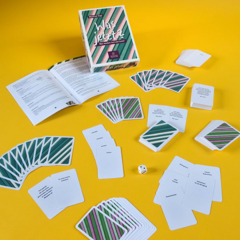 Die Spielaufgabe besteht darin, den Verlauf dieser Situationen von Carl und Carla mit Hilfe der zusätzlichen 144 Wortkarten mit Substantiven und Verben in